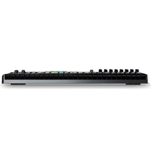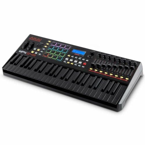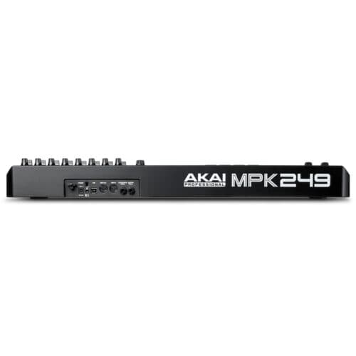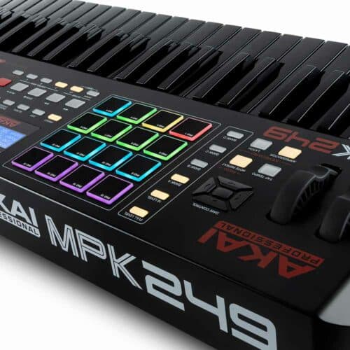 The Akai MPK249 Black Edition is a semi-weighted 49 full-size key midi keyboard with Aftertouch. It features 16x RGB-illuminated MPC pads each with 4x banks for a total of 64x pads.