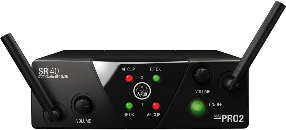 The AKG WMSS40DVIAC is a dual wireless microphone system with a handheld vocal microphone and instrument body pack. The perfect combo for an acoustic artist on stage wanting a great sounding wireless solution to amplify their guitar and voice. This wireless system gives you complete freedom to move around without worrying about the restrictions of cables, operating on the 660.700 & 662.300 MHz frequency bands (A & C Band). Delivering crystal clear sound and is a true plug'n'play microphone solution. It is the perfect wireless solution for small stages, clubs, places of worship, hotels, and gyms. The system is comprised of 3 main components; the handheld transmitter (1x HT40 mini), the body pack transmitter (PT40 mini) and the dual receiver (SR40 mini dual). The WMS40 Mini system is a stand out for its extremely long battery life of 30 hours with a single alkaline AA battery which helps saving money in the long run. *Please Note: You cannot use more than 1x wireless microphone per band in the same area at the same time.