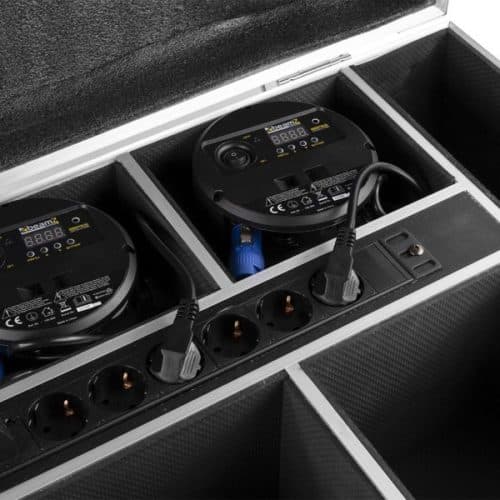 Beamz BBP66 Uplight Par Flightcase is the perfect solution for safely transporting and charging BBP66 wireless battery uplight fixtures. This durable, rolling road case with easily handles is the perfect solution for mobile use. When the show is over, simply connect the fixtures to the internal charging module and use the external plug to connect directly into standard wall voltage. The next day, your fixtures are fully charged and ready to go again. Each case holds up to 6 fixtures with enough space for all power cables.