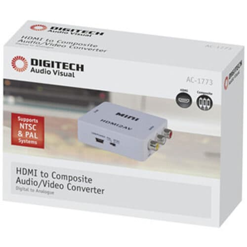 The Digitech AC1773 is a HDMI to Composite AV Converter. This unit will convert your digital HDMI signal to a standard composite audio/video signal. This makes AC1773 very handy for adapting a DVD player or gaming console to an older TV, since many of these new devices no longer offer analogue outputs. Supports PAL and NTSC standards. USB cable and power supply are included to provide power to the AC1773.