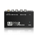 The LD Systems PPA2 is a very compact analogue phono preamplifier, which equalises the extremely low output signal of conventional turntables to RIAA standards. It allows you to connect to devices without any phono input, such as mixers, PA power amplifiers or sound cards. The phono inputs are designed as RCA jacks, just like the line outputs; the PPA 2 also has a screw terminal for the ground conductor of the turntable and a 6.3 mm stereo jack for connecting a headset. The THD factor of the preamplifier is below 0.05% and the channel separation is -75 dB. The LD Systems PPA 2 uses a 12 V AC adapter; a bright LED indicates the power supply on the top of the sturdy metal chassis.Features