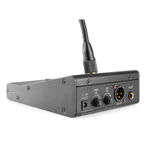 The rear of the base includes an included 12V DC power connection that powers the microphone. There are also 2x separate knobs for the Chime and Microphone Volume. These controls offer independent volume controls for both lines. The TM370 utilises a Balanced Out 3-pin XLR output socket for sending the output signal. Finally, a Mix out 6.3mm unbalanced output jack is available.