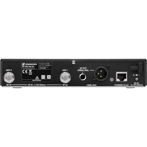 The robust, metal EM 300-500 G4 receiver offers a high-contrast, black-&-white OLED display. The display uses a streamlined menu system with a jog wheel and dedicated Escape button for quick menu navigation. The display also shows the battery status of the associated transmitter. The system features 20 fixed frequency banks with up to 32 compatible frequency presets and 6 user banks with up to 32 user-programmable frequencies. To prevent interference, the EM 300-500 receiver's true-diversity reception compares incoming signals on two independent receiver circuits to ensure optimal RF quality. The built-in equalizer enables you to change the frequency response of the output signal; you can reduce the bass range and boost the treble range. The receiver also offers an adjustable output level range of 48 dB to match the audio input of your mixing board or PA system. A headphone output with volume control is conveniently located on the front panel, allowing you to monitor your audio signal. The back panel houses a balanced XLR output as well as an unbalanced 1/4" output. A kit is included for rackmount installation. The unit comes with a universal power supply and EU, US, UK, Korea, Australia, and China adapters.