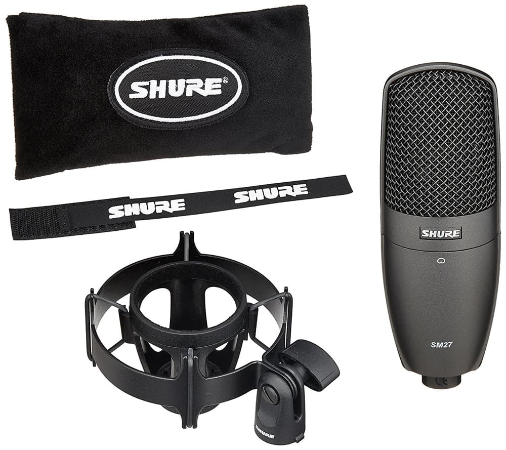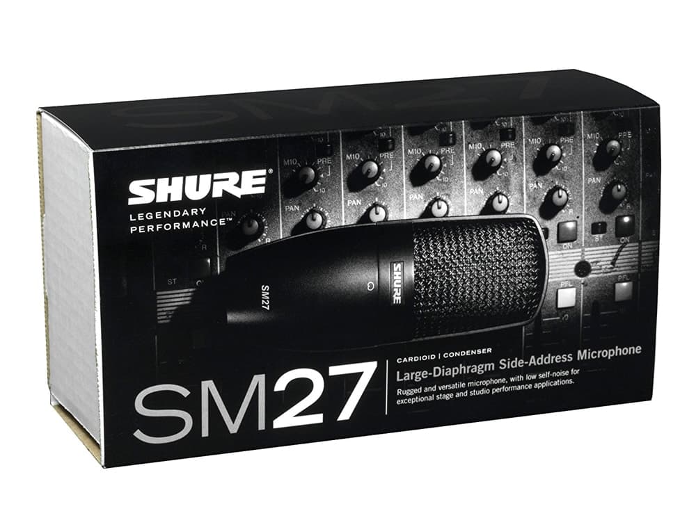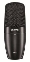The Shure SM27 is a rugged and versatile large-diaphragm, side-address cardioid condenser microphone. It has low self-noise and extended frequency response that picks up vocal and instrument nuances with clarity. Durable Shure construction features three separate mesh layers that reduce wind and breath noise. Equally comfortable on stage or in the studio.