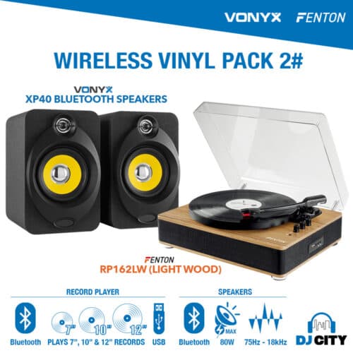 Introducing the DJ City exclusive Wireless Vinyl Pack 2 (PK-RP162LWXP) featuring the Fenton RP162LW (Light Wood) and Vonyx XP40 Bluetooth Speakers. This special pack allows you to play all your favourite 7”, 10” and 12” vinyl wirelessly via Bluetooth.